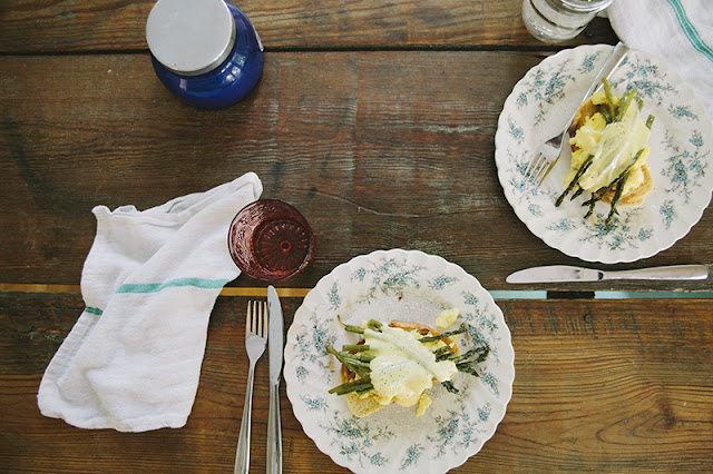 toss asparagus with grape seed oil on a baking sheet and then sprinkle with sea salt and pepper. roast in a 350 degree oven for 15 minutes or until golden brown. we made scrambled eggs, but you can make them how you prefer. i think i will try a fried egg next time. toast your bread. we buttered ours because buttery toast is one of my favorite things, but you can leave yours dry if you prefer. layer toast, eggs, asparagus and then top with hollandaise sauce.